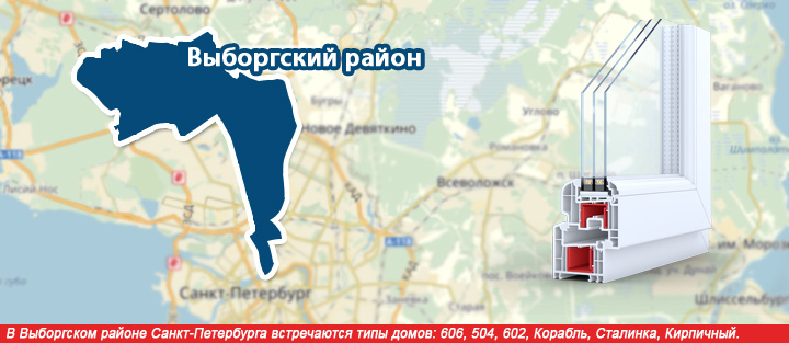 В северной части города располагается самый продолжительный район, построенный вдоль Выборгского шоссе. Площадь составляет 116 км², в застройке преобладают многоэтажные кирпичные дома. Пластиковые окна в Выборгском районе желательно устанавливать в комплектации, которая будет противостоять холодному климату Санкт-Петербурга. Выбор стеклопакета и оконного профиля является ключевым этапом перед монтажом пластикового окна. Технические характеристики изделия напрямую зависят от количества камер в стеклопакете, а так же ширины профильной системы. Учитывая расположение Выборгского района и высокую плотность населения, окна должны защищать не только от холода, но еще от шума исходящего с улицы.